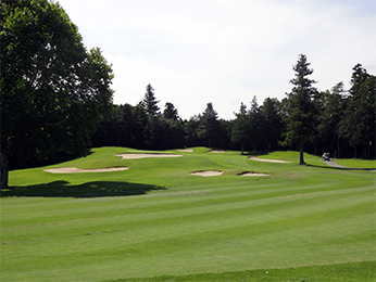距離のないほぼストレートなミドルホール。グリーン両サイドのバンカーは深く、出せたとしてもグリーンが馬の背になっていて、ピンに寄せるのは難しい。