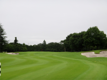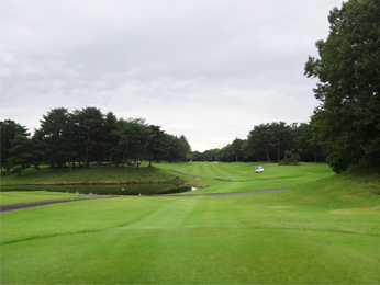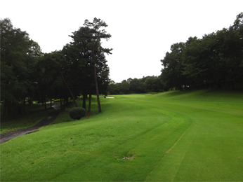 ティーショットの落とし処は広い。グリーンまで150y地点の左に池、中央に松の木がある。グリーンの手前にグラスバンカー、右手前に林があり、ピンが右サイドにある場合は林がスタイミーになる。グリーンの奥行き34y