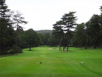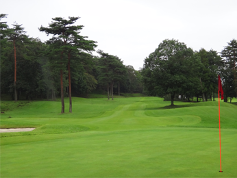 左ドッグレッグのミドル。ティーショットは左クロスバンカーの右に落とさないと、グリーンまで120y地点の右サイドの数本の松の木がスタイミーになる。グリーン奥はすぐ池ですので、オーバーには注意。グリーンの奥行き34y