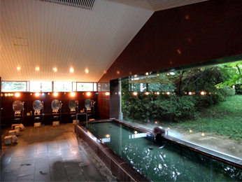 お風呂場:少し手狭に感じるが、清潔感に溢れ、浴槽からの眺めは四季の恵みを感じられる。