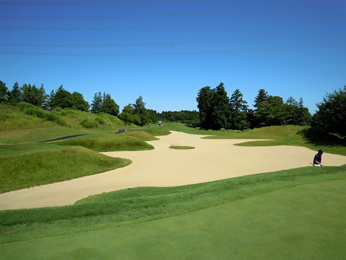 ティインググランドからの景色は広々としていますが、狙いどころを定めて正確に打っていかないと2打目以降の難易度が変わってきます。又、グリーン周りにも池・バンカー・グラスバンカー・マウンド等数多くのトラップが待ち受けていますので、ダイレクトにグリーンを狙う技術・距離感が求められます。