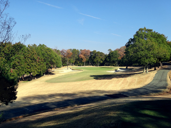豪快な打ち下ろしになるミドルホール。ティーショットの落とし所が狭く感じられる。グリーン手前90ヤードからグリーン左サイド奥まで池なのでセカンドショットは池に注意。